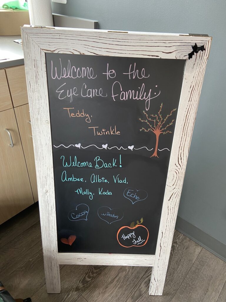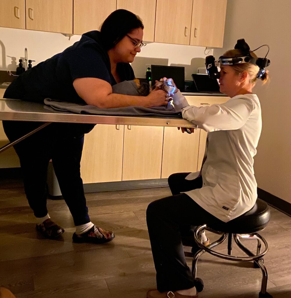 Dr. Hibbs first looked at Molly and, after a short Q&A, said Molly was right as rain. No return visit was needed. Because this was Twinkle’s first visit and we didn’t know the seriousness of her vision problems, her exam was a little longer.